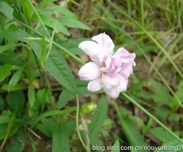藤牡丹学名缠枝牡丹(Calystegia dahurica (Herb.) Choisy f. anestia )又名藤本牡丹,为旋花科打碗花属植物。茎左旋缠绕,主蔓粗度可达0.3cm~0.4cm,单叶互生,莲花形花座花形似牡丹,花粉色,重瓣( 40~50个花瓣)撕裂状,形状不规则,花瓣裂片向内变狭,没有雄蕊和雌蕊,6 月中旬始花, 直至上冻时蔓上仍有许多花蕾。缠枝牡丹既抗严寒又耐高温,既喜阳又耐轻度遮阴,带根移苗极易成活,不需缓苗,原产我国,常见于路旁以至海拔1500-3100米的山坡上。藤本牡丹花期长,盛花期,日开花量近百朵,如色彩斑斓的挂毯,壮丽美观,是多种形式绿化的佳品。