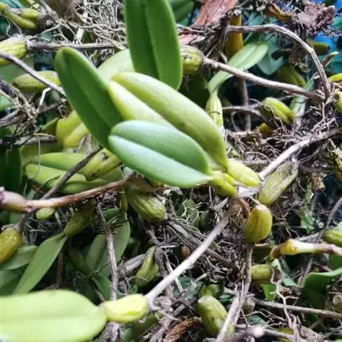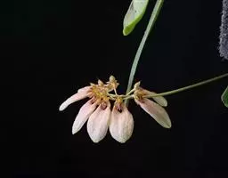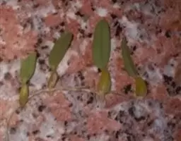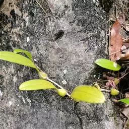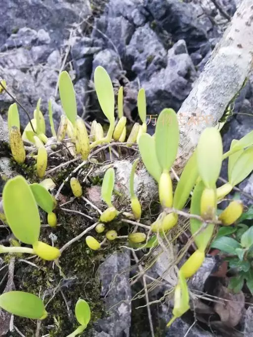 广东石豆兰(学名:Bulbophyllum kwangtungense Schltr.):根状茎粗约2毫米,当年生的常被筒状鞘,在每相隔2-7厘米处生1个假鳞茎。根出自生有假鳞茎的根状茎节上。假鳞茎直立,圆柱状,顶生1枚叶,幼时被膜质鞘。叶革质,长圆形。花葶1个,从假鳞茎基部或靠近假鳞茎基部的根状茎节上发出,直立,纤细,总状花序缩短呈伞状,具2-7 朵花;花淡黄色;萼片离生,狭披针形;花瓣狭卵状披针形,长4-5毫米,中部宽约0.4毫米,逐渐向先端变狭,先端长渐尖,具1条脉或不明显的3条脉,仅中肋到达先端,边缘全缘;唇瓣肉质,狭披针形,向外伸展。花期5-8月。