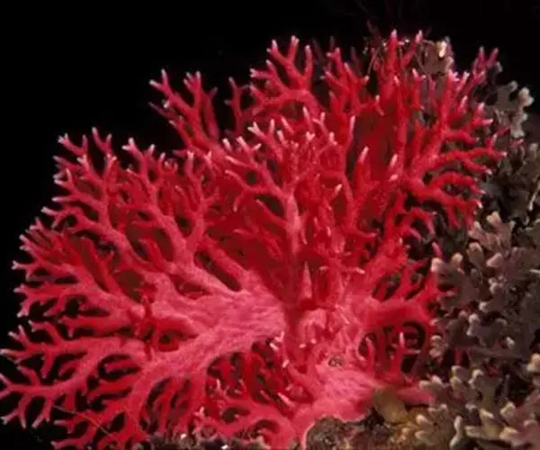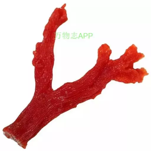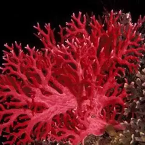 红珊瑚(学名:Corallium rubrum)营群体生活。个体直径一般为0.5mm~2cm,每个个体具8个羽状触手。隔膜8个不成对,隔膜肌向腹生长,隔膜丝单叶状。仅有一个口道沟,位于腹面。骨骼多在体内,或由体内发生后伸向体表。具有钙质中轴骨,呈树状分枝,但不在一个平面上,骨骼呈淡粉红色至深红色。除中轴骨外,均有钙质骨针分布在中胶层中,常与造礁珊瑚生活在一起。骨骼质地坚密、色泽鲜艳,常作宝石或雕刻材料,生长在温度高于20℃的赤道及其附近的热带、亚热带地区。中国古代皇帝的朝珠即由红珊瑚制成;也可入药,有定惊明目之功效。由于大量开采,数量急剧减少,被列为中国一级保护动物。