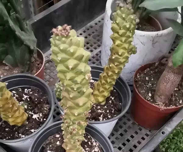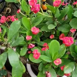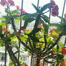 虎刺梅:别称铁海棠,是蔓生灌木植物。茎多分枝,长60-100厘米,直径5-10毫米,具纵棱,密生硬…