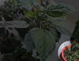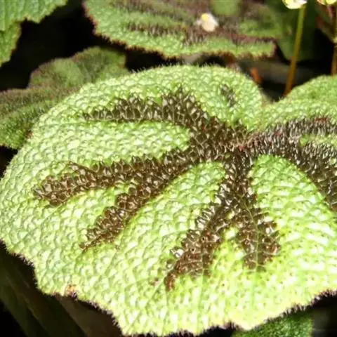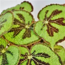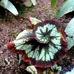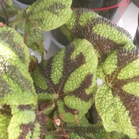 由漆斑菌(Myrotheciumroridum)引起的秋海棠叶斑病症状:病症一般出现在秋海棠叶片边缘、叶尖和破损叶片的叶脉上。坏死区域呈现黑褐色,然后是水渍状。诊断方法是下部的叶片经常会不规则形状的孢子群,中央呈黑色,但边缘为白色。