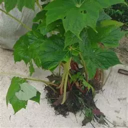 基生叶未见。茎生叶互生,具柄;叶片两侧不相等,轮廓斜卵形或偏圆形,长12-20厘米,宽10-16厘米,先端渐尖至长渐尖,基部微心形至心形,边缘有疏的又极浅的三角形之齿,齿尖常有短芒,掌状3-7浅至中至深裂,裂片形状和长短均变化较大,从窄三角形至宽三角形,通常又再浅裂,上面深绿色,散生短小硬毛,下面淡绿色,亦被短小之毛,沿脉较密,有时有绒毛状之毛,掌状5-7条脉。下面明显;叶柄长5-10厘米,被褐色长毛,近顶端较密;托叶膜质,披针形,长约1.5厘米,先端有刺尖头,边有短缘毛。