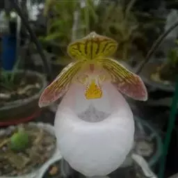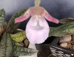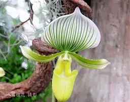 (五) 换盆: 通常在开过花后,新根长出之前换盆,最适当地时期是夜晚的温度高于12~13摄氏度。换盆不需要每年进行,约两年一次即可。若只想栽培成大株,只要换个大盆移株即可;若要繁殖,则要进行分株。由于拖鞋兰的根不多,并要小心翼翼,千万不可折损根部。换盆时,用竹筷将旧的植材小心除掉,并去除腐根。若使用的植材是水苔,可在素烧盆底填入丽龙碎块,以利排水。若使用轻石作植材,由于素烧盆容易干燥,不妨改用陶瓷盆种植。使用水苔为植材时,除了要压实使之紧密之外,如能添加牡蛎壳或石灰岩碎片,效果更好。换盆后半个月内要放置在阴暗处,浇水量减少,经常实施叶面浇水,以促进新根的生长。这段时间若浇水过多,反而延迟其发根,此点要特别注意。