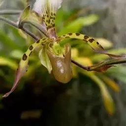 无苞杓兰(学名:Cypripedium bardolphianum W. W. Smith et Farrer):植株高8-12厘米,具细长而横走的根状茎。茎直立,较短,顶端具2枚叶。叶近对生,平展或斜立;叶片椭圆形。花序顶生,直立,具1花;花较小,通常萼片与花瓣淡绿色而有密集的褐色条纹,唇瓣金黄色;花瓣长圆状披针形,斜歪,长1.5-1.8厘米,宽5-6毫米,先端急尖,常多少围抱唇瓣,无毛;唇瓣囊状,腹背压扁。蒴果椭圆状长圆形,无毛,果期花序柄仍继续延长。花期6-7月,果期8月。