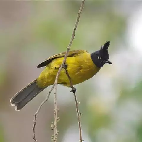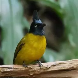 黑冠黄鹎:体长18-21厘米,是一种中等体型偏黄色鹎。整个头、颈、颏、喉黑色,头顶有显著直立的羽冠,…