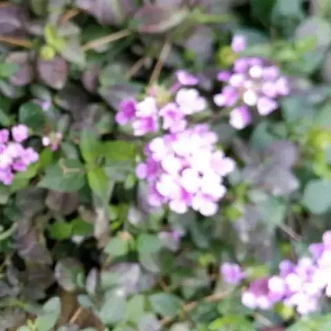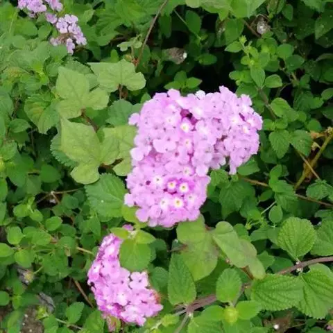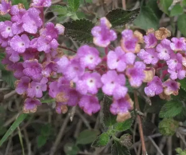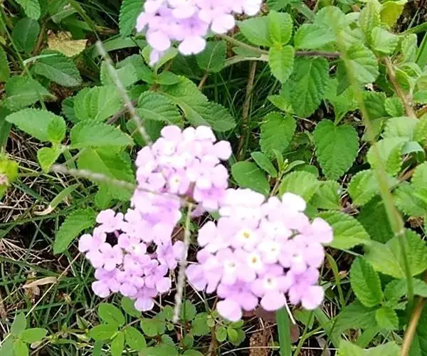 蔓马缨丹是一种灌木;枝下垂,被柔毛,长0.7~1米。叶卵形,长约2.5厘米,基部突然变狭,边缘有粗牙齿。