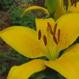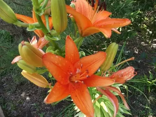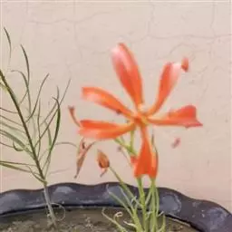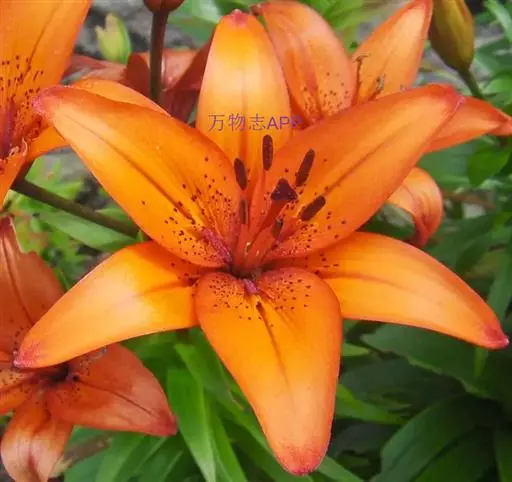毛百合(学名:Lilium dauricum Ker Gawl.):鳞茎卵状球形,高约1.5厘米,直径约2厘米;鳞片宽披针形,长1-1.4厘米,宽5-6毫米,白色,有节或有的无节。茎高50-70厘米,有棱。叶散生,在茎顶端有4-5枚叶片轮生。花1-2朵顶生,橙红色或红色,有紫红色斑点;外轮花被片倒披针形,内轮花被片稍窄,蜜腺两边有深紫色的乳头状突起。蒴果矩圆形,长约4-5.5厘米,宽3厘米。花期6-7月,果期8-9月。