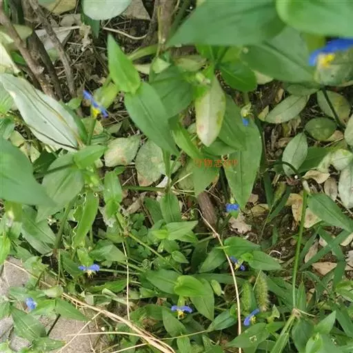 鸭跖草 别名:碧竹子、兰花草、竹叶菜、鸡冠菜、鸭抓菜、淡竹叶。长于各地。生于路边,水沟边及荒野阴湿处,易于采集。味平淡。嫩茎叶肉质多汁,可作蔬菜,5~6月间采集炒食或作汤,或拌面蒸食。可治各种感染发烧的病(单味水煎服),和各种出血,痢疾,毒蛇咬伤等。草本,茎斜向上,基部伏于地面,有时节上生根。叶片披针形,有绿色脉。花呈深蓝色。花苞小,有总梗。