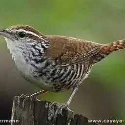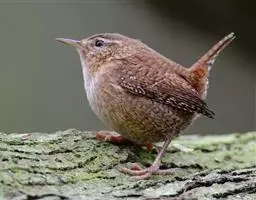 莺鹪鹩(图2) 莺鹪鹩是一种小型鸣禽,身长11-13厘米。这可能是唯一容易与冬鹪鹩混淆的品种,区别是它的体积更小,尾巴更短,它较暗的下体没有明显的斑纹。