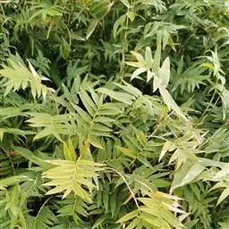 凤尾竹 Raeusch. ex Schult. ’Fernleaf’ R. A. Young)是禾本科,簕竹属孝顺竹的变种。植株较高大,杆高可达6米,竿中空,小枝稍下弯,下部挺直,绿色;竿壁稍薄;节处稍隆起,无毛;叶鞘无毛,纵肋稍隆起,背部具脊;叶耳肾形,边缘具波曲状细长繸毛;叶舌圆拱形,叶片线形,上表面无毛,下表面粉绿而密被短柔毛,小穗含小花,中间小花为两性;外稃两侧稍不对称,长圆状披针形,先端急尖;内稃线形,脊上被短纤毛,花药紫色,子房卵球形,羽毛状。成熟颖果未见。原产中国,华东、华南、西南以至台湾、香港均有栽培。凤尾竹喜温暖、湿润和阳光充足的环境,耐寒。宜土层深厚、肥沃、疏松的微酸性壤土。该种观赏价值较高,宜作庭院丛栽,也可作盆景植物。全草或根入药,味淡、微苦,性寒,有清热利湿、凉血止血、消肿解毒功效,可治痢疾、泄泻等多种病症。凤尾