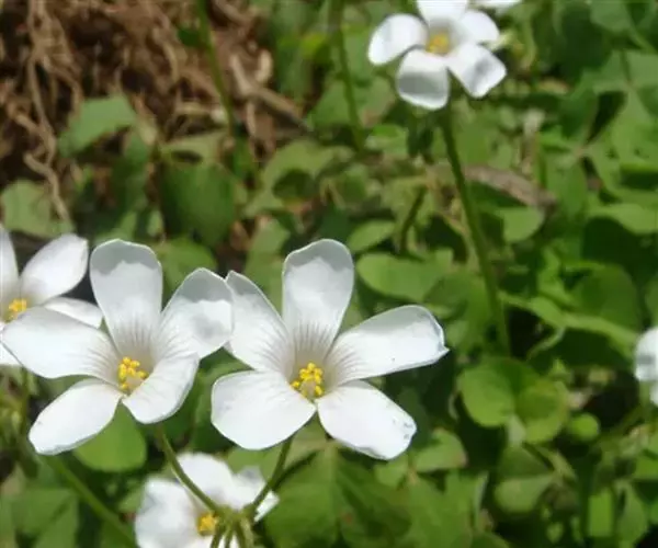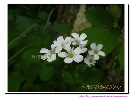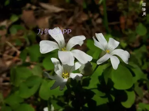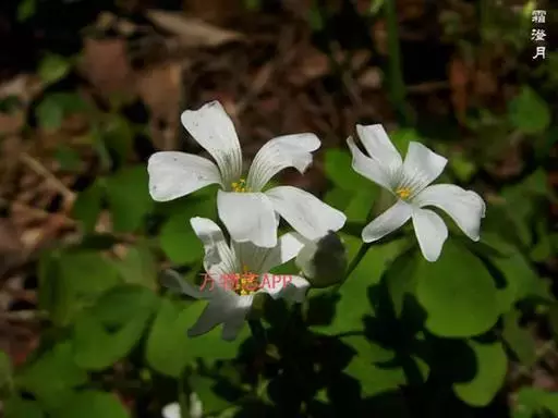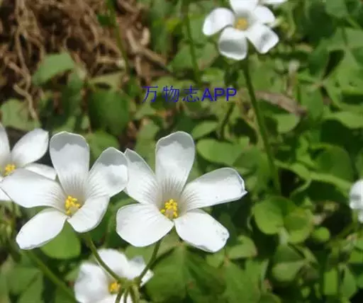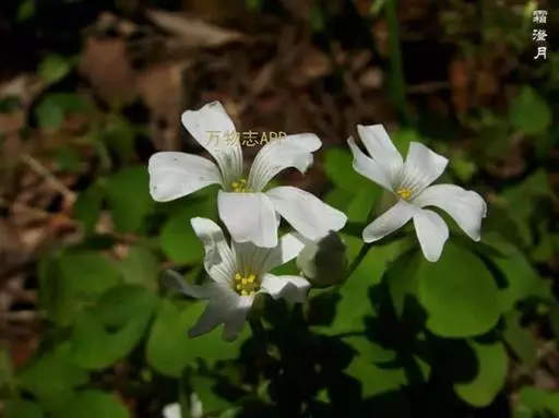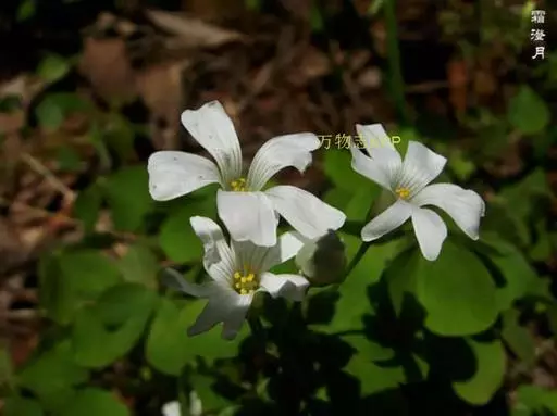 白花酢浆草(学名:Oxalis acetosella Linn.):又名山酢浆草,是酢浆草科酢浆草属的多年生草本植物,具有匍匐的根茎;小叶3,倒心形;花通常白色,单生。