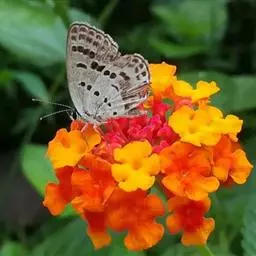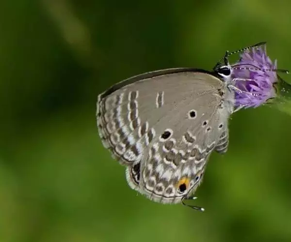 曲纹紫灰蝶(学名:Chilades pandava )是鳞翅目灰蝶科昆虫。成虫体长10-12毫米,翅展20-35毫米,翅面紫蓝色,前翅外缘黑色,后翅外缘有细的黑白边。翅反面灰褐色,缘毛褐色,两翅均具黑边。后翅有2条带内侧有新月纹白边,翅茎有3个黑斑,都有白圈。尾突细长,端部白色。