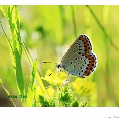 红珠灰蝶翅白色,半透明羽毛状。前翅及前缘布各有一层橙色鳞片。中室中部及横脉处各有不同大小黑色斑。…