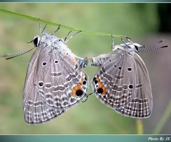 成虫:体长10-12毫米,翅展20-35毫米,翅面紫蓝色,前翅外缘黑色,后翅外缘有细的黑白边,其内为黑色窄带。翅反面灰褐色,缘毛褐色,两翅均具黑边,前翅亚外缘有2条具白边的灰白带,后中横斑列也具白边,在2a和Cu2室的斑斜,中室端纹棒状。后翅有2条带内侧有新月纹白边,Cu2室端黑色冠以大的橙黄斑,后中横斑列中前端1个黑斑和m2至Cu2室3斑连成一曲纹,翅茎有3个黑斑,都有白圈。尾突细长,端部白色。