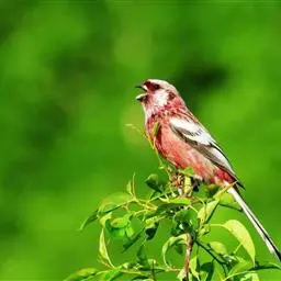 红腰朱雀:体长12-14厘米,小型鸟类。雄鸟前额和眉纹玫瑰粉红色,头顶和一宽的贯眼带深红褐色,背红…