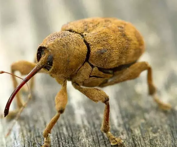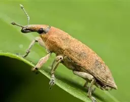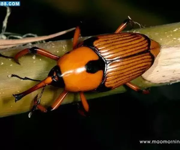 甘薯小象虫属鞘翅目,蚁象虫科。成虫体长5~8毫米,体形细长如蚁。全体除 触角 末节、前胸和 足呈桔红色外,其余均为蓝黑色而有金属光泽。头部延伸成细长的喙,状如象鼻,咀嚼式口器着生于喙的末端。膝状触角10节,雄虫触角末节成棍棒状,雌虫则成长卵状。前胸长为宽的2倍,在后部1/3处缩入如颈状。两鞘翅合起来呈长卵形,显著隆起。鞘翅表面具不明显的小刻点。足细长。卵椭圆形,长约0.6毫米,初产时乳白色,后变淡黄色,表面有小刻点。
