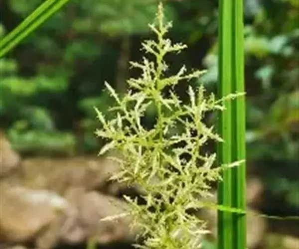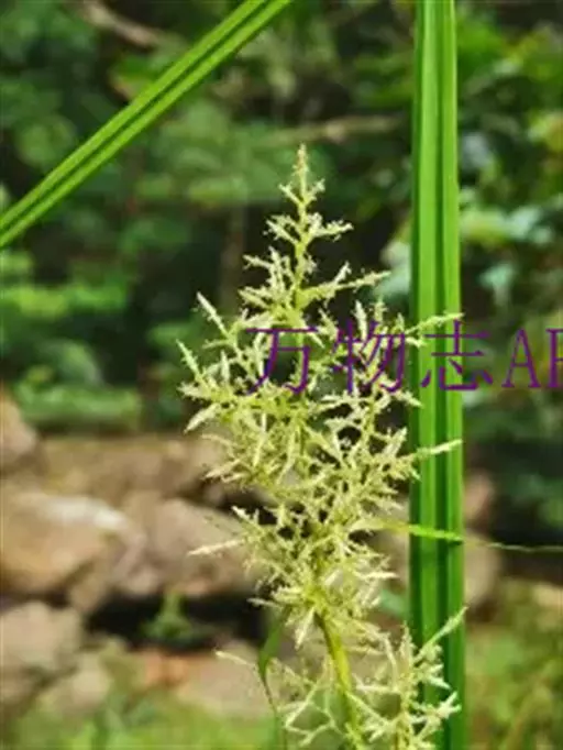圆锥花序复出,长20-40厘米;支圆锥花序数个,通常单生,少有双生,轮廓为卵状三角形,长4-15厘米,宽3-6厘米,支花序柄坚挺,钝三棱形,最下部1个长10-18厘米,向上部的渐短,平滑;支花序轴锐三棱形,密生短粗毛;小苞片鳞片状,长约1.5毫米,背面被短粗毛;枝先出叶囊状、内无花,背面有数脉,被短粗毛。小穗极多数,全部从枝先出叶中生出,横展,长5-12毫米,两性,雄雌顺序;雄花部分与雌花部分近等长。