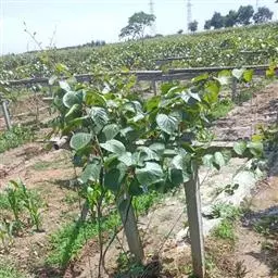 和平1号 和平1号株系从引自湖南的美味猕猴桃嫁接苗砧木萌发而成,1990年选出,植株生长势中等,分枝较密,枝较纤细,叶中等大,较厚,浓绿色。1年生枝呈灰褐色,皮孔较小。萌芽期3月中旬或下旬,花期4月下旬到5月初,果实成熟期10月上中旬,果实在枝条上可留到12月份。落叶期12月中旬,生育期250天左右。