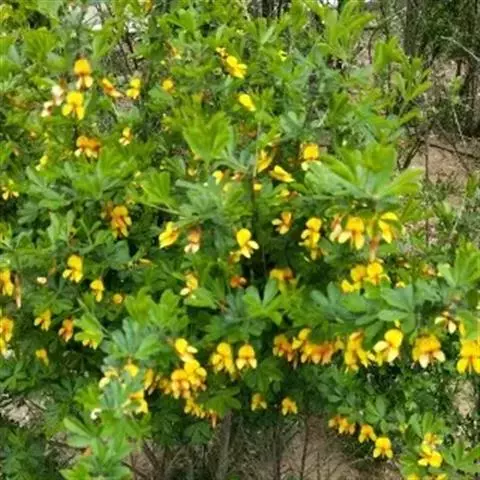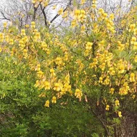 灌木,高0.7-1.5厘米,由基部多分枝。老枝深灰色,一年生枝浅褐色,嫩枝有条棱,被伏贴短柔毛。羽状复叶有 (2) 3-4(5)对小叶;托叶在长枝者硬化成针刺,长2-5毫米,宿存,短枝者脱落;叶轴在长枝者硬化成针刺,长1.5-4厘米,宿存,粗壮,短枝者纤细,脱落;小叶倒卵形、狭倒卵形或长圆形,长4-12毫米,宽3-5毫米,先端钝,有刺尖,基部稍狭,两面近无毛或疏被短伏贴柔毛。花梗单生,长1-2.5厘米,中上部具关节,苞片早落;花萼钟状管形,长6-10毫米,近无毛;花冠黄色,长26-30毫米,旗瓣宽卵形,翼瓣长圆形,瓣柄长约为瓣片的1/3-1/2,耳齿状,龙骨瓣的瓣柄长约为瓣片的3/4,耳短小,子房近无毛。荚果长2-3厘米,宽约4毫米。花期4-5月,果期7月 。