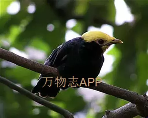 全长200-230毫米。头顶金黄色,上体黑色具铜绿色金属光泽,眼后、颈、肩以及尾羽均辉黑色。翼黑,初级飞羽基部黄色,外缘白色,形成鲜明翼斑。颏、喉鲜黄色,下体余部黑色。眼周裸皮。栖于海拔1000米以下的阔叶林内。杂食性。