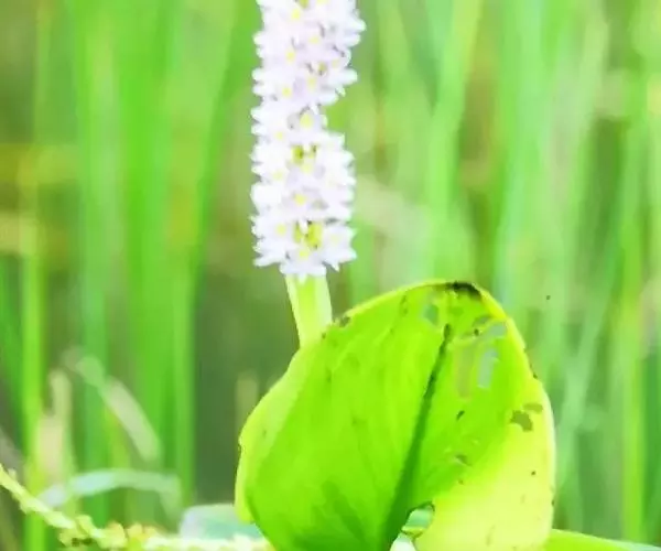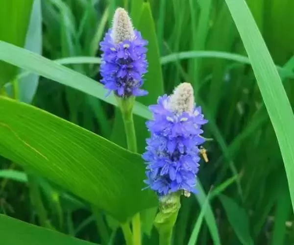 梭鱼草(学名:Pontederia cordata L.)是雨久花科,梭鱼草属多年生挺水或湿生草本植物,株高可达150厘米,地茎叶丛生,圆筒形叶柄呈绿色,叶片较大,深绿色,表面光滑,叶形多变,但多为倒卵状披针形。花葶直立,通常高出叶面,穗状花序顶生,每条穗上密密的簇拥着几十至上百朵蓝紫色圆形小花,上方两花瓣各有两个黄绿色斑点,质地半透明,5-10月开花结果。