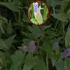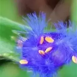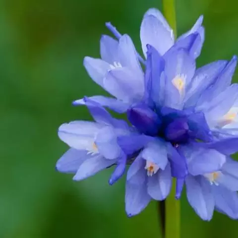 梭鱼草 穗状花序顶生,长5-20厘米,小花密集在200朵以上,蓝紫色带黄斑点,直径约10毫米左右,花被裂片6枚,近圆形,裂片基部连接为筒状。果实初期绿色,成熟后褐色;果皮坚硬,种子椭圆形,直径1-2毫米。花果期5-10月。