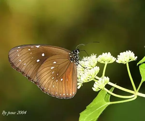 雄蝶翅暗褐色,基部较深,向端部渐浅,蓝色光泽弱,前翅后缘向外凸呈阔弧形,中室端部上和下均有1个白点,近顶端1个不明显,外缘白点列不明显,亚端部有5一6个白点,在CU2室中部有1个短的性标斑;后翅前缘灰白色,外缘和亚外缘白点列不显。翅反面棕色;前翅后缘灰白色有光泽,中室内和外各有1个白点;后翅外缘和亚外缘各有1列白斑,中室内有1个白点,中室端部外附近有白点。 雄雌色彩斑纹基本相似,但雌蝶前翅后缘平直,无性标斑。