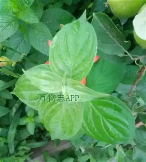 草本,高30-80厘米;茎外倾或上升,具6条钝棱和浅沟,节常膨大膝曲状,近无毛或节处被疏柔毛。叶卵状椭圆形,顶端短渐尖,基部阔楔形或稍下延,长2-7厘米,宽1.5-3.5厘米,纸质,绿深色,两面近无毛或背面脉上被疏柔毛;叶柄长5-25毫米。花序腋生或顶生,由3-4个聚伞花序组成,每个聚伞花序有1至少数花,具长3-5毫米的总花梗,下面有2枚总苞状苞片,总苞片阔倒卵形或近圆形,稀披针形,大小不等,长6-12毫米,宽3-7毫米,顶端有小凸尖,具脉纹,被柔毛;小苞片线状披针形,长约4毫米;花萼裂片5,钻形,长约4毫米;花冠淡紫红色,长约10-12毫米,外面被柔毛,2唇形,上唇阔卵状近圆形,全缘,有紫红色斑点,下唇长圆形,3浅裂;雄蕊2,花丝被柔毛,药室2,卵形,一上一下。蒴果长约6毫米,被柔毛,开裂时由蒴底弹起,具种子4粒。