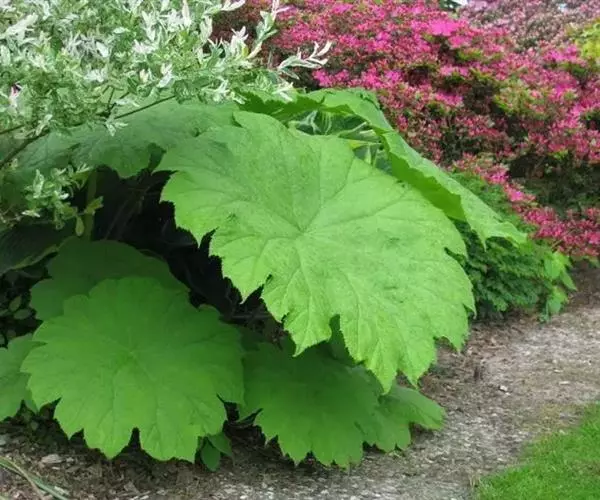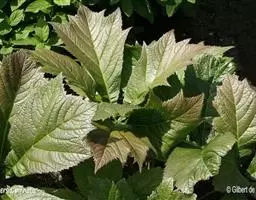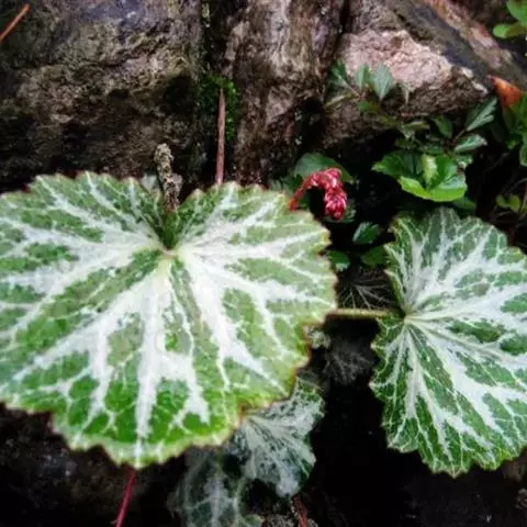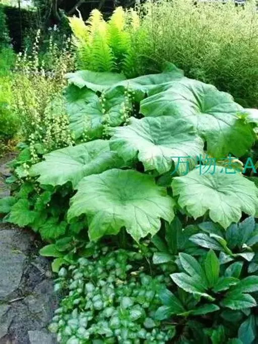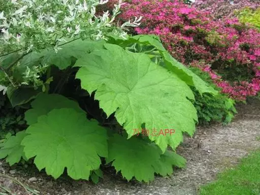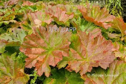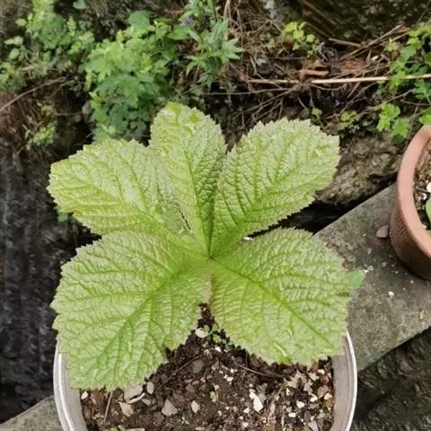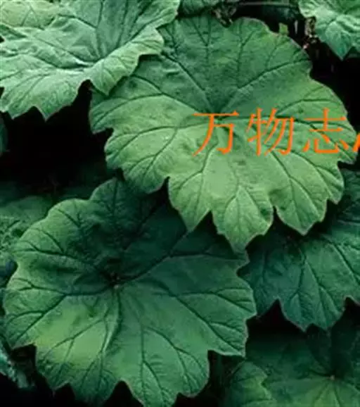 大叶子:又名山荷叶、佛爷伞。多年生草本,高1-1.5m。根茎粗壮,暗褐色,长达35cm,节上生不定根。茎不分枝,下部疏生短硬腺毛。基生叶单一,盾状着生;叶柄长30-60cm,基部扩大成鞘状,抱茎,被刺状硬腺毛;叶片近圆形或卵圆形,直径18-60(-100)cm,掌状浅裂,宽卵形,先端急尖或短渐尖,常再浅裂,边缘具不规则重锯齿,两面被短硬毛;茎生叶较小,掌状3-5浅裂,基部楔形或截形。圆锥花序顶生,长15-20cm;花小,白色或微带紫色;萼片4-5,卵形,先端钝或微凹,背面疏生近无柄之腺毛,5脉与先端汇合;花瓣4-5;雄蕊8;心皮2,下部合生,子房半下位。蒴果。种子狭卵形,具翅。花期6-7月,果期8-9月。