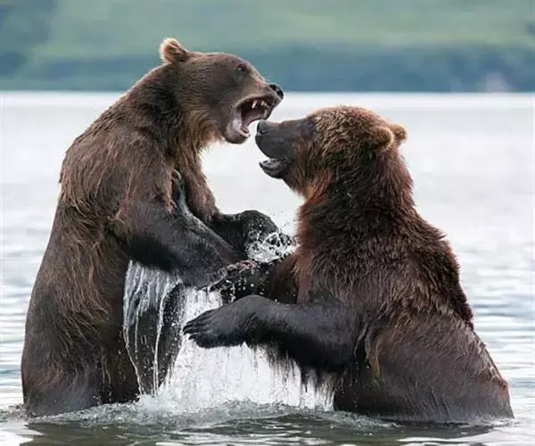 棕熊是相当好斗的动物,特别是在保护领地和食物的时候。为了保护食物,它们会赶走狼群和山狮,也会打跑侵入它们领地的其他熊。不过多数的打斗仍然集中在交配季节。母棕熊为了抚育孩子,通常每隔3-5年才会交配一次,为了让母熊们尽早进入交配阶段,公熊们会找机会杀死这些母熊的孩子,尽管勇敢的母亲们在遭遇这些身型大它1.5倍甚至两倍的家伙的时候奋力搏斗,但在幼子死亡事件中仍有45%是公熊们的作为。