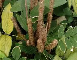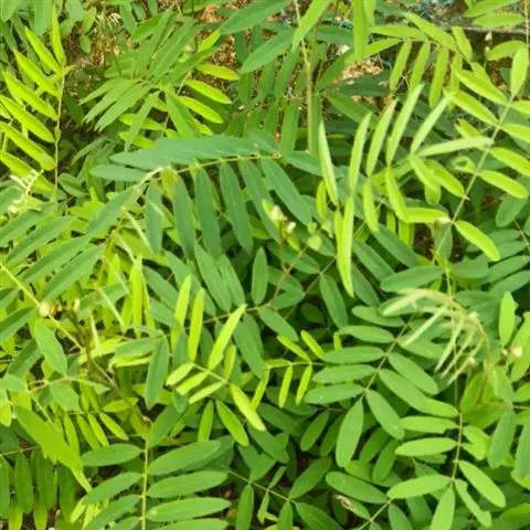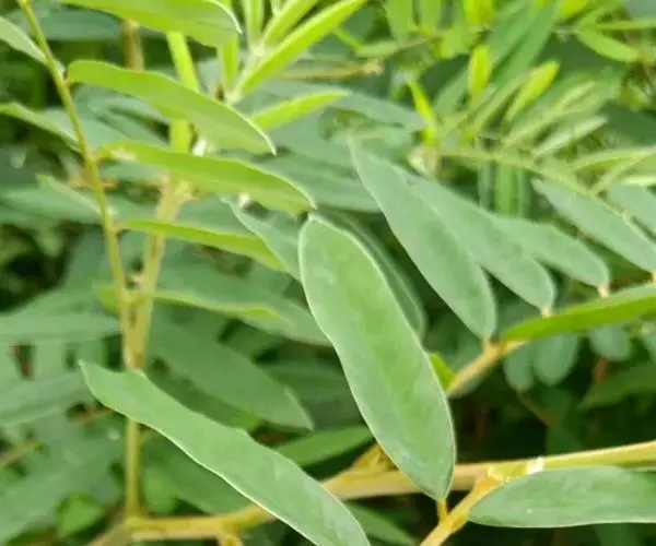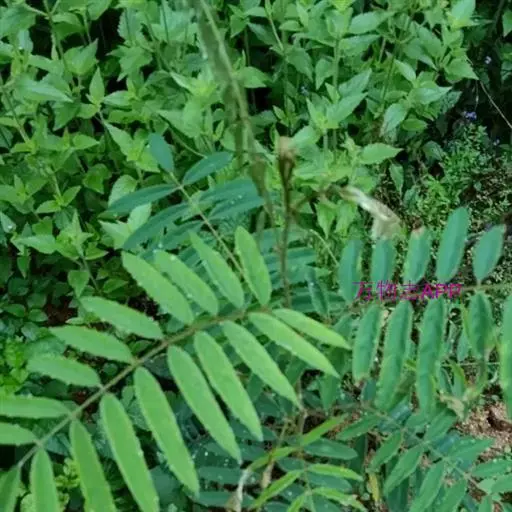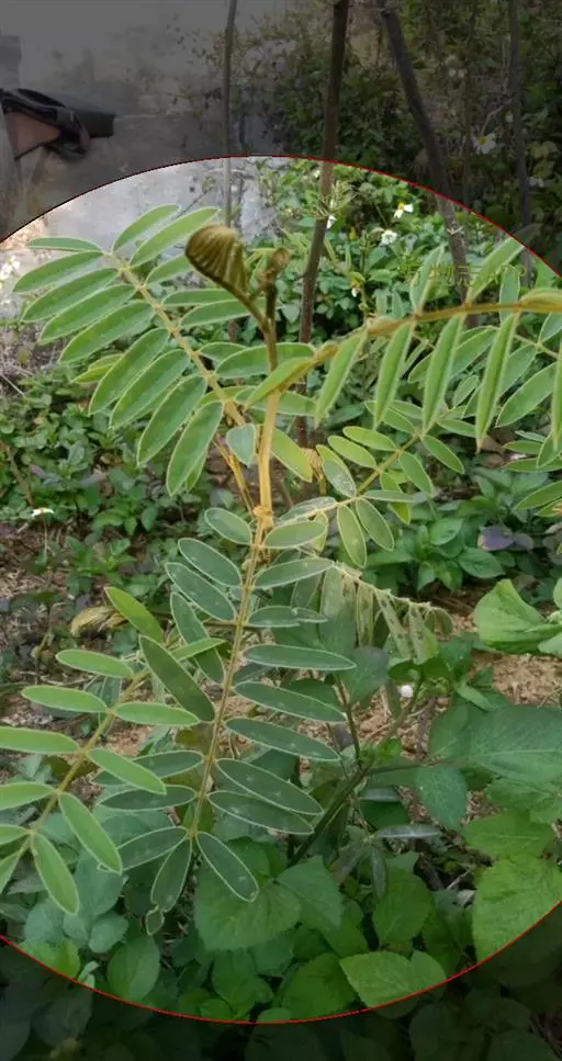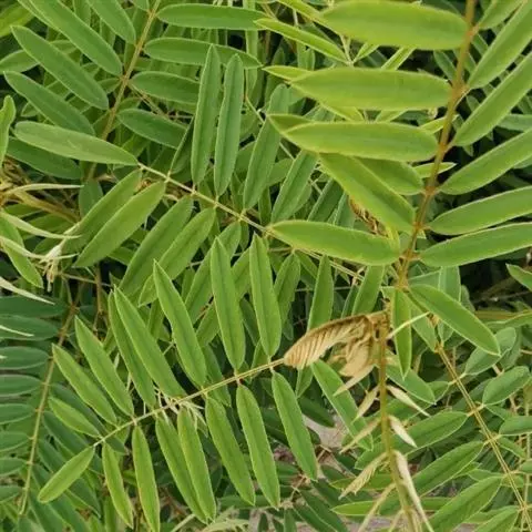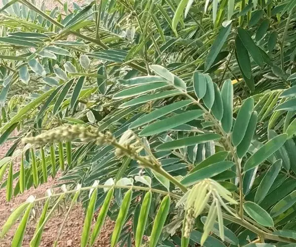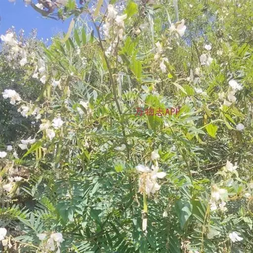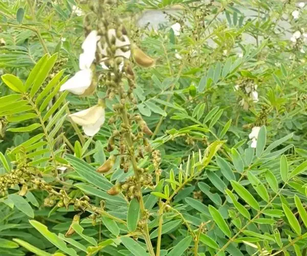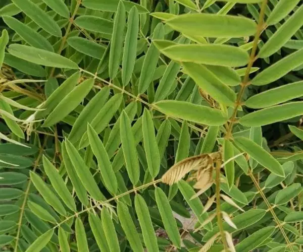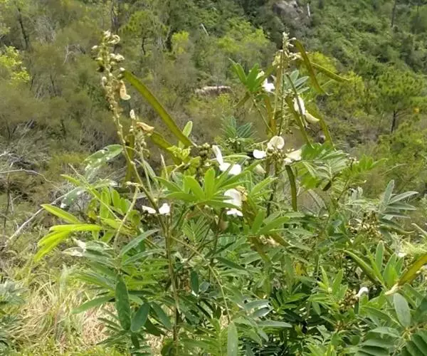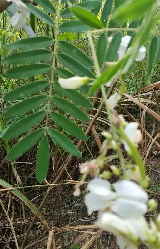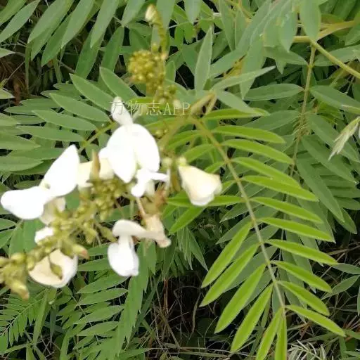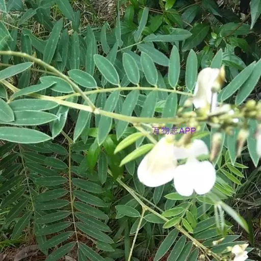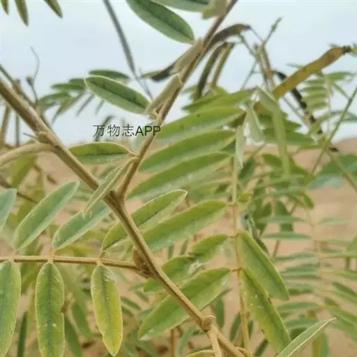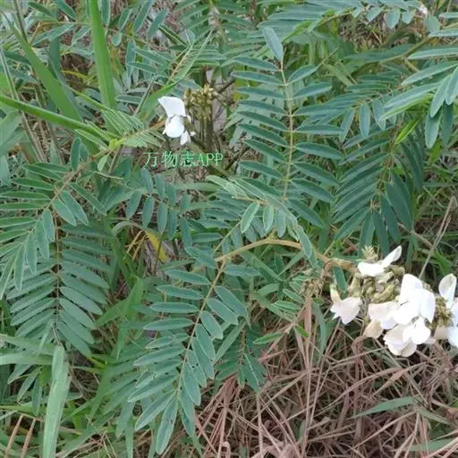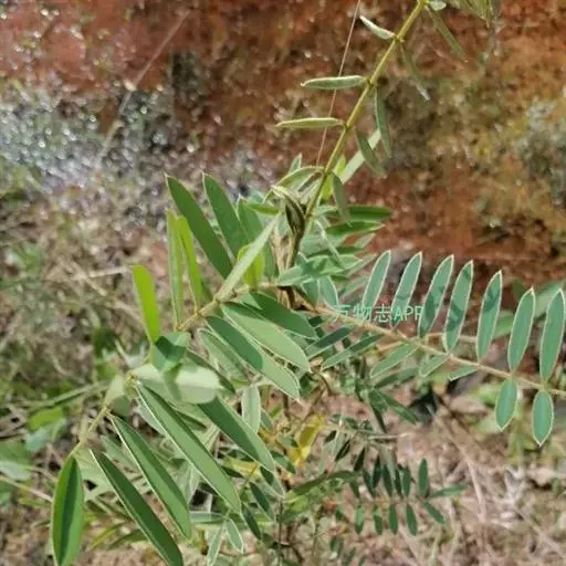 灌木状草本,高1-3.5米。茎木质化,具纵棱,与叶轴同被灰白色茸毛,毛长约0.75-1毫米。羽状复叶长15-25厘米;叶柄长1-3厘米,叶轴上面有沟;托叶三角状钻形,刚毛状直立,长4-7毫米,被毛,宿存;小叶8-12对,长圆形,长3-6厘米,宽6-1.4厘米,先端具细凸尖,上面无毛,下面密被平伏绢毛,侧脉30-50对,纤细,稍隆起;小叶柄长3-4毫米,密被茸毛。