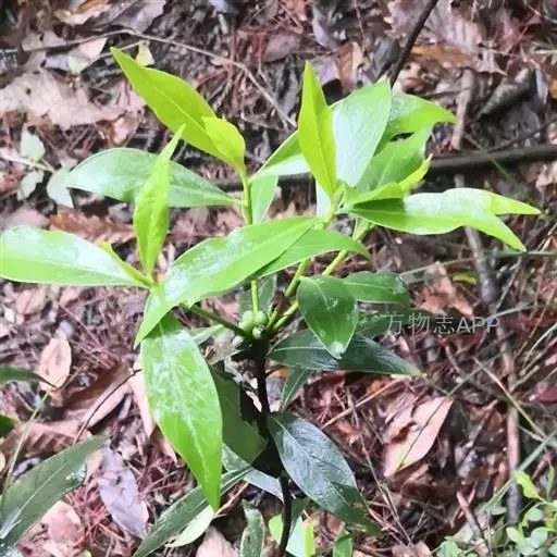常绿直立灌木,高0.5-1.2米,二歧状或伞房分枝;枝深紫色或紫红色,通常无毛,有时幼嫩时具粗绒毛;腋芽近圆形或椭圆形,鳞片卵形,顶端圆形,稀钝形,除边缘具淡白色流苏状缘毛外无毛,通常褐色。叶互生,有时簇生于枝顶,叶片革质,椭圆形或披针形,长6-12厘米,宽1.8-3厘米,两端渐尖,基部下延于叶柄,边缘全缘,微反卷,上面深绿色,具光泽,干燥后有时起皱纹,下面淡绿色,中脉纤细,上面通常凹陷,下面微隆起,侧脉6-7对,纤细,上面微凸起,稀微凹下,下面不甚明显;叶柄两侧翅状,长6-8毫米,褐色。花白色,有时淡黄白色,9-12朵簇生于枝顶,呈头状花序,花序下具苞片;苞片褐绿色易早落,长圆状披针形,外面大的苞片长达 15毫米,宽4毫米,内面小的苞片长8毫米,两面无毛,顶端尾尖或渐尖,边缘具短的白色流苏状缘毛;几无花序梗,花梗长1-2毫米,密被淡黄绿色粗绒毛;花萼筒圆筒状,外面下部密被淡黄绿色丝状绒毛,上部较稀疏,长10-14毫米,裂片4,卵状三角形或卵状长圆形,长约5毫米,顶端钝尖,无毛;雄蕊8,2轮,分别着生于花萼筒上部及中部,花丝长约2毫米,花药长的长圆形,长约2.1毫米;花盘短杯状,长0.7毫米,边缘全缘或微波状,外面无毛;子房无毛,倒圆锥状圆柱形,长2.2毫米,顶端渐尖,窄成短的花柱,柱头头状,直径0.7毫米。果实红色,广椭圆形或卵状椭圆形,长10毫米,直径5-6毫米。花期11至次年2月,果期4-5月。 [2-3]