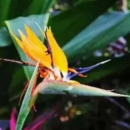 鹤望兰,别名天堂鸟,为鹤望兰科鹤望兰属的一种多年生草本植物;无木质树干;花序生于与叶柄近等长或稍短的花序梗上,佛焰苞1;花较小,萼片橙黄色,长7.5-10厘米,箭头状花瓣基部具耳状裂片,暗蓝色;花期在冬季。该物种原产非洲南部,在中国南方大城市的公园、花圃有栽培,北方则为温室栽培。性喜温暖湿润、阳光充足的气候,适宜生长的温度为25℃左右,耐干旱、较耐寒、不耐水湿,要求疏松肥沃、排水良好,以土层深厚的沙壤土为宜。因花形美丽似鹤,花开时犹如仙鹤翘首远望,花朵寿命亦长,故中文名为鹤望兰。鹤望兰素有“鲜切花之王”的美誉,是一种名贵的观赏花卉,深受广大消费者喜爱。同时,鹤望兰也宜大盆栽植,布置在公园、客厅、会议室、展厅候机室等处。鹤望兰是美国洛杉矶市的官方花卉象征。