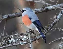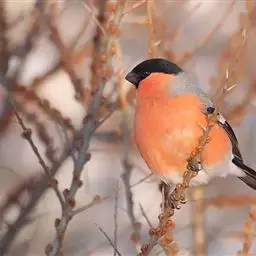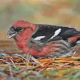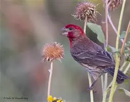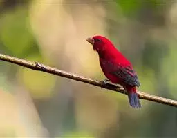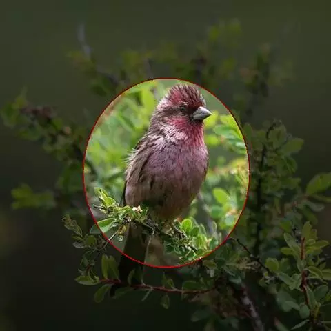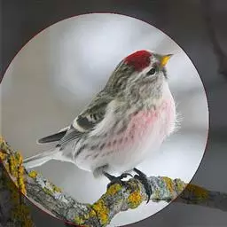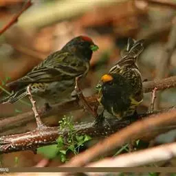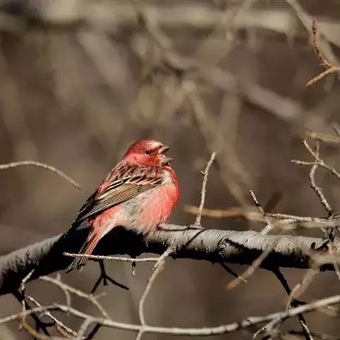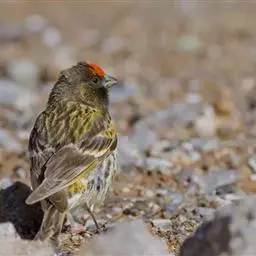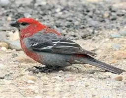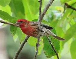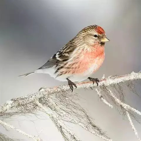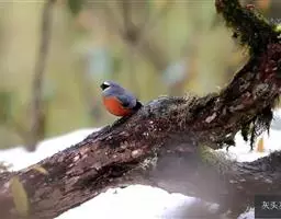 红腰朱雀:体长12-14厘米,小型鸟类。雄鸟前额和眉纹玫瑰粉红色,头顶和一宽的贯眼带深红褐色,背红…