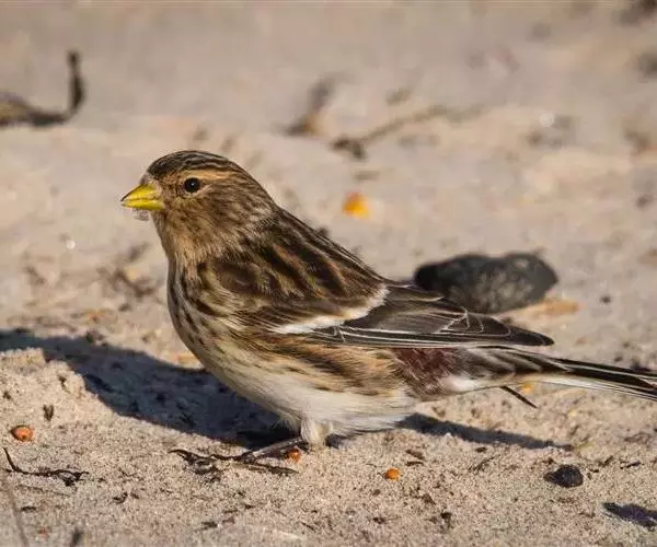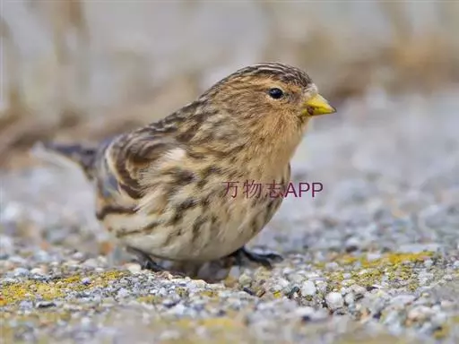 黄嘴朱顶雀(学名:Linaria flavirostris):为燕雀科金翅雀属的鸟类。体重10-18克,体长112-162毫米。是一种体型小的褐色具纵纹的雀鸟。腰粉红或近白。与其他朱顶雀的区别在头顶无红色点斑,体羽色深而多褐色,尾较长,叫声也不同。个体大小和羽色近似白腰朱顶雀,但额上和胸无红色,而腰部呈玫瑰红色;下体有暗色斑纹;雌鸟似雄鸟但腰暗,初级飞羽少白色边缘。与赤胸朱顶雀的区别在嘴黄且小,头褐色较浓,颈背及上背多纵纹,翼上及尾基部的白色较少。虹膜深褐色,嘴黄色;脚近黑色。