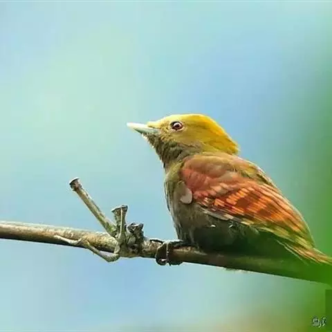 雌鸟和雄鸟相似,但腰下无红色、呈淡皮黄色具淡褐色纵纹和白色羽缘。