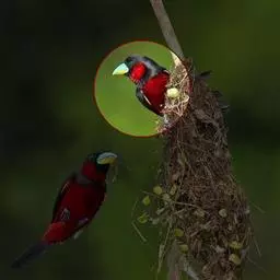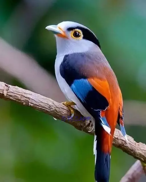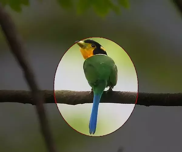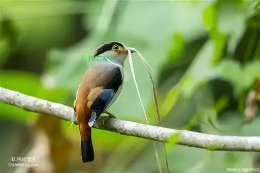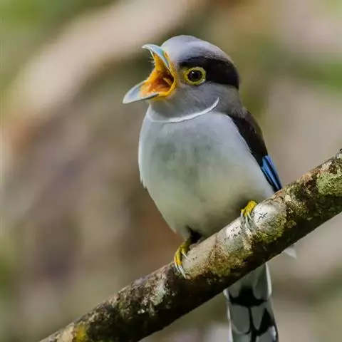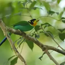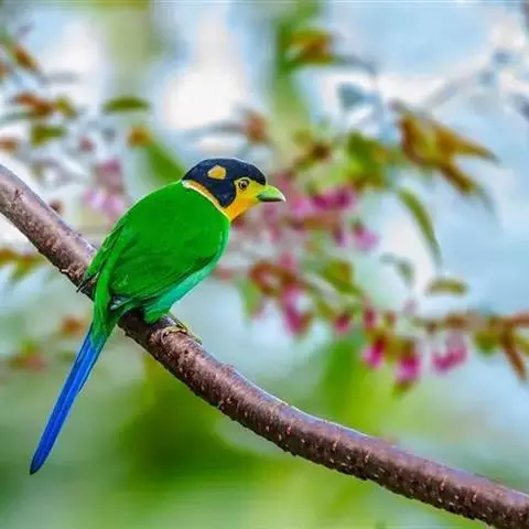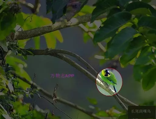 长尾阔嘴鸟是雀形目阔嘴鸟科的鸟类,体长约25厘米,是绿色阔嘴鸟。形长的楔形尾蓝色,喉及脸黄色,顶冠…