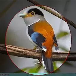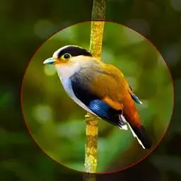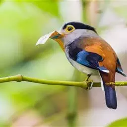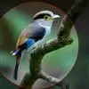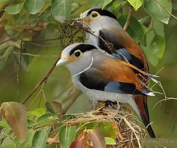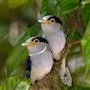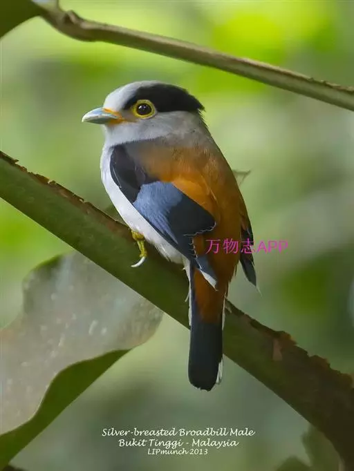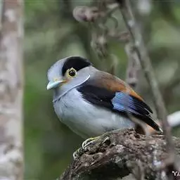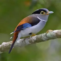 银胸丝冠鸟(学名:Serilophus lunatus)是雀形目阔嘴鸟科的鸟类,在全世界共分化为10个亚种。体长16-18厘米。嘴宽阔、天蓝色,基部橙色。鼻孔圆形具宽阔的黑色眉纹。上背烟灰色,下背至尾上覆羽栗色,两翅的翼缘白色,翼角羽缘缀浅灰蓝色,覆羽和羽端均为亮黑色,翅膀表面具有显著的亮蓝色和白色翼镜。尾羽黑色,中央两对纯黑,第三对多少沾一些白色,其余尾羽均具宽阔的白色端斑,呈凸尾型。跗蹠和趾蓝绿色。属热带森林鸟类,栖息于海拔90-1400米热带、亚热带地区的各种类型的树林中,主要以昆虫为食,也吃植物果实。