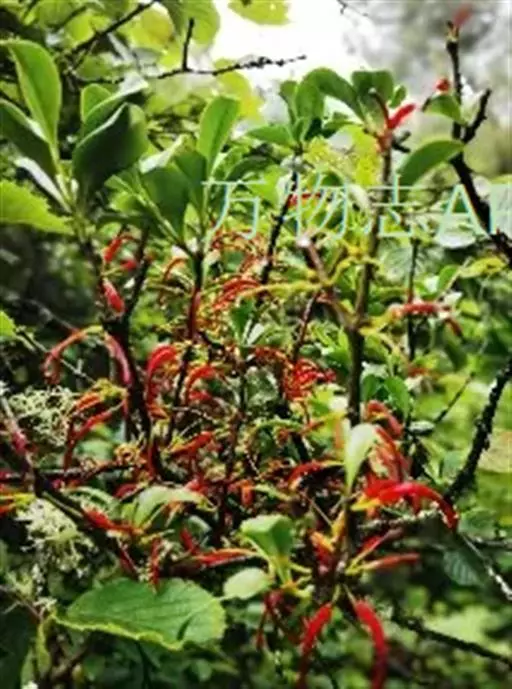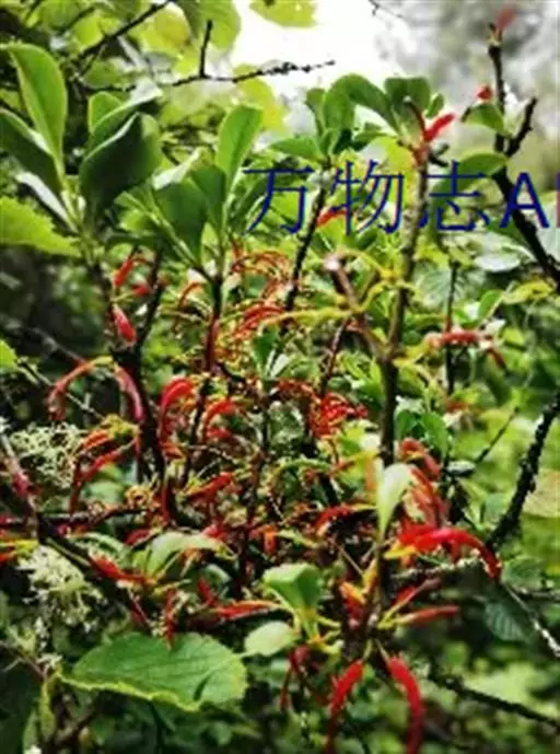 柳叶钝果寄生 灌木,高0.5-1米,全株无毛;二年生枝条黑色,具光泽。叶互生,有时近对生或数枚簇生于短枝上,革质,卵形、长卵形、长椭圆形或披针形,长3-5厘米,宽1.5-2厘米,顶端圆钝,基部楔形,稍下延;侧脉3-4对,叶柄长2-4毫米。伞形花序,1-2个腋生或生于小枝已落叶腋部,具花2-4朵,总花梗长1-2毫米或几无,花梗长4-6毫米;苞片卵圆形,长约2毫米;花红色,花托椭圆状,长约2.5毫米.浅齿,稀具撕裂状芒;花冠花蕾时管状,长2-3厘米,稍弯,顶部椭圆状,裂片4枚,披针形,长6-9毫米,反折;花丝长约2毫米,花药长3-4毫米;花柱线状,柱头头状。果椭圆状,长8-10毫米,直径4毫米,黄色或橙色。花期2-7月,果期5-9月。