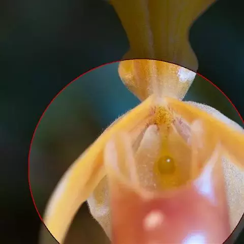 大型附生植物。茎粗壮,近直立,长达1米,粗8-20毫米,不分枝,节间长2-3厘米,具多数二列的叶。叶近肉质,带状,斜立,长17-40厘米,宽3.5-5厘米,先端钝并且不等侧2圆裂,基部具宿存而抱茎的鞘。花序腋生或与叶对生,近直立,长7-30厘米,不分枝或有时具短分枝,具多数花;花序柄长5-11厘米,粗5-8毫米,被2-3枚三角形的肉质短鞘;花苞片肉质,宽三角形,长3-5毫米,先端钝;花梗和子房黄绿色,肉质,长约1厘米,粗3毫米;花黄色带紫褐色横纹,不甚开展,具香气,萼片和花瓣近直立;萼片相似,等大,长圆形,长10-12毫米,宽5-6毫米,先端钝;花瓣狭倒卵形,长8-9毫米,宽3-4毫米,先端钝;唇瓣白色,厚肉质,3裂;侧裂片与中裂片垂直,近方形,内面具紫褐色纵条纹;中裂片近直立,内面和背面基部具少数紫褐色横纹,卵状舌形,长5-6毫米,中部稍向外弯,先端钝,边缘稍波状并且具不规则的缺刻;距圆锥形,长约3毫米,末端淡黄色,钝的,内壁密被毛;蕊柱两侧紫红色,粗短,长约2.5毫米,粗约2毫米;药帽黄色,半球形;花粉团2个,每个劈裂为不等大的2爿;粘盘柄倒披针形,长约1.2毫米;粘盘近卵形,较粘盘柄的基部宽,先端近截形并且具凹缺。蒴果近直立,圆柱形或长纺锤形,长约6厘米,粗8-15毫米。花期8-9月,果期10-11月。