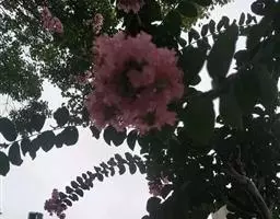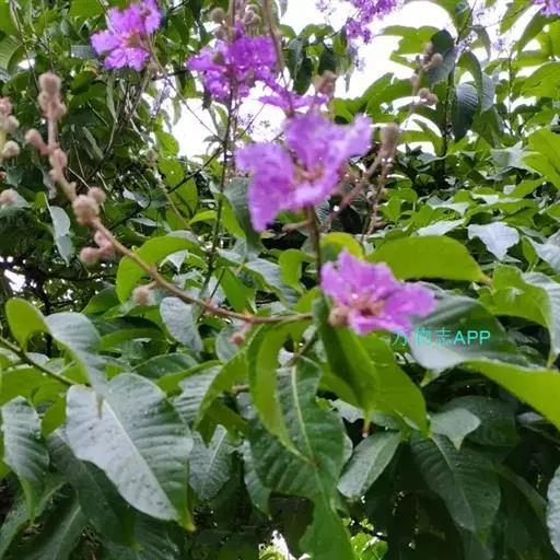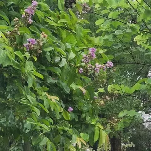 大花紫薇 大乔木,高可达25米;树皮灰色,平滑;小柱圆柱形,无毛或微被糠批状毛。叶革质,矩圆状椭圆形或卵状椭圆形,稀披针形,甚大,长10-25厘米,宽6-12厘米,顶端钝形或短尖,基部阔楔形至圆形,两面均无毛,侧脉9-17对,在叶缘弯拱连接;叶柄长6-15毫米,粗壮。花淡红色或紫色,直径5厘米,顶生圆锥花序长15-25厘米,有时可达46厘米;花梗长1-1.5厘米,花轴、花梗及花萼外面均被黄褐色糠粃状的密毡毛;花萼有棱12条,被糠粃状毛,长约13毫米,6裂,裂片三角形,反曲,内面无毛,附属体鳞片状;花瓣6,近圆形至矩圆状倒卵形,长2.5-3.5厘米,几不皱缩,有短爪,长约5毫米;雄蕊多数,达100-200;子房球形,4-6室,无毛,花柱长2-3厘米。蒴果球形至倒卵状矩圆形,长2-3.8厘米,直径约2厘米,褐灰色,6裂;种子多数,长10-15毫米。花期5-7月,果期10-11月。