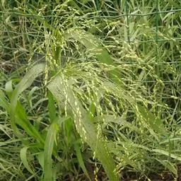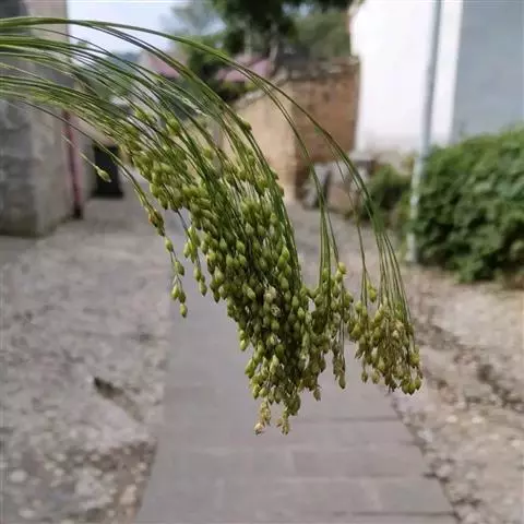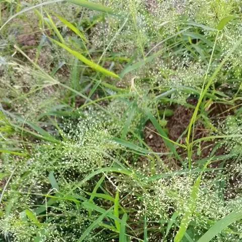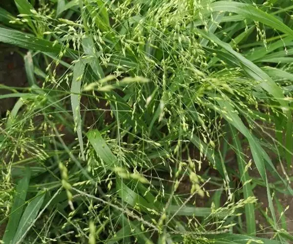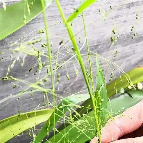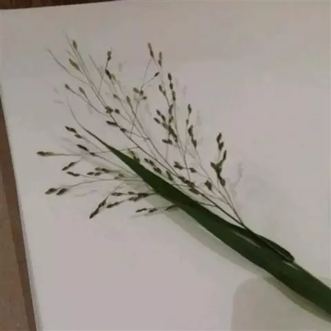 ,下部的常长于节间;叶舌膜质,截形,长约1毫米,顶端被睫毛;叶片线形,长8-15厘米,宽4-6毫米,质较柔软,顶端渐尖,基部圆钝,两面无毛。圆锥花序开展,长10-20厘米,宽可达15厘米,基部常为顶生叶鞘所包,花序分枝纤细,微粗糙,上举或开展;小穗卵状长圆形,长约3毫米,顶端尖,无毛,有柄,顶端膨大,柄长于小穗;第一颖宽卵形,顶端尖,长约为小穗的1/3,具3-5脉,或侧脉不明显;第二颖长卵形,与小穗等长,顶端喙尖,具11-13脉;第一外稃与第二颖同形,近等长,具9-11脉,内稃薄膜质,具2脊,几与外稃等长,但狭窄;第二外稃狭长圆形,革质,表面平滑,光亮,长约2.2毫米。鳞被细小,多脉,长约0.3毫米,宽约0.38毫米,局部折叠,肉质,染色体2n=54 (Ramanathan,1950)。