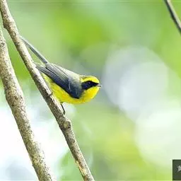 黑脸鹟莺:体长10厘米,是有特色的体小而多彩的莺鸟。粗眉纹,颏、喉及尾下覆羽黄色,脸罩黑,…
