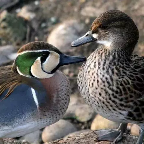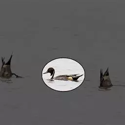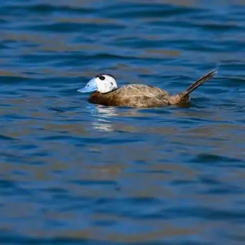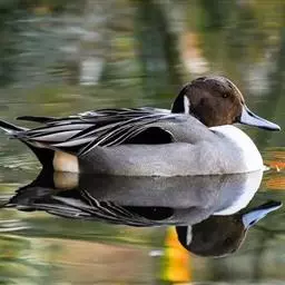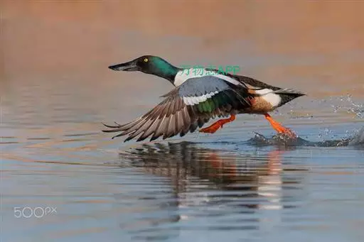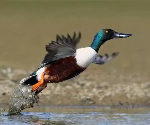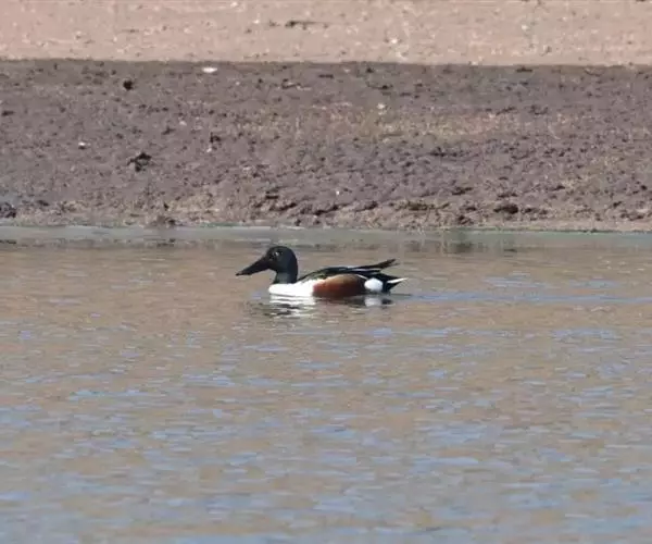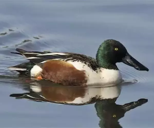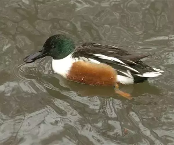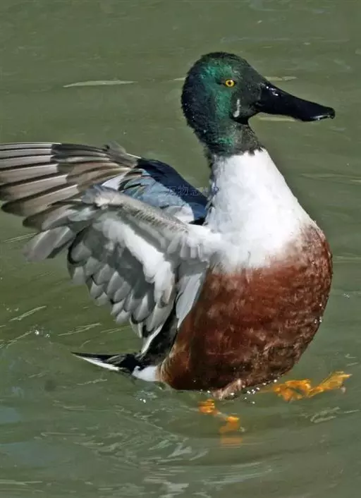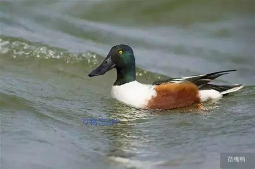 琵嘴鸭(学名:Anas clypeata):属中型鸭类,个体比绿头鸭稍小,体长43-51厘米,体重0.5千克左右。雄鸭头至上颈暗绿色而具光泽,背黑色,背的两边以及外侧肩羽和胸白色,且连成一体,翼镜金属绿色,腹和两胁栗色,脚橙红色,嘴黑色,大而扁平,先端扩大成铲状,形态极为特别。雌鸭略较雄鸭为小,外貌特征亦不及雄鸭明显,也有大而呈铲状的嘴。