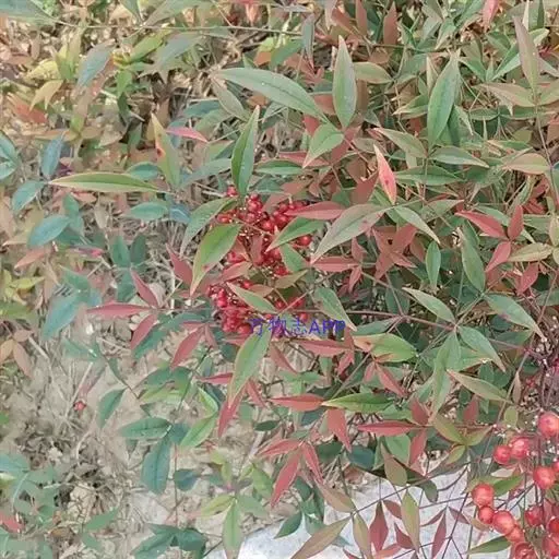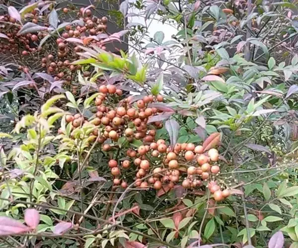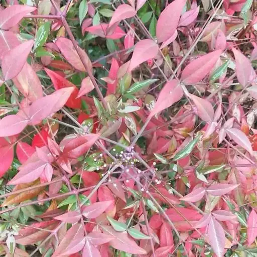 (3)水肥要因时因生长发育期而异。南天竹喜湿润但怕积水。生长发育期间浇水次数应随天气变化增减,每次都不宜过多。一般春秋季节每天浇水一次,夏季每天浇两次,保持盆土湿润即可。开花时,浇水的时间和水量需保持稳定,防止忽多忽少,忽湿忽干,不然易引起落花落果,冬季植株处于半休眠状态,要控制浇水。若浇水过多易徒长,妨碍休眠,影响来年开花结,果;南天竹喜肥,5~9月,可每15~20天施一次稀薄饼肥水,约每两个月浇一次0.2%硫酸亚铁水。幼苗期施液肥宜淡不宜浓(液肥与水按1:10),成株期可稍浓些(液肥与水按1:8)。雨季改施干肥,每月一次,每盆约20~40克。