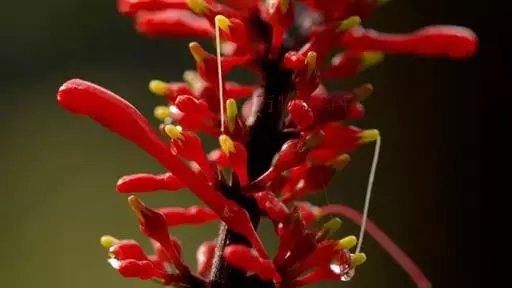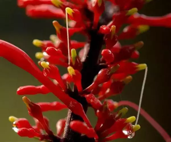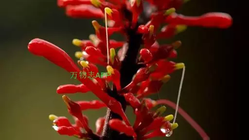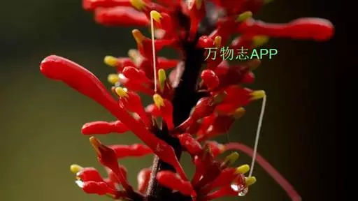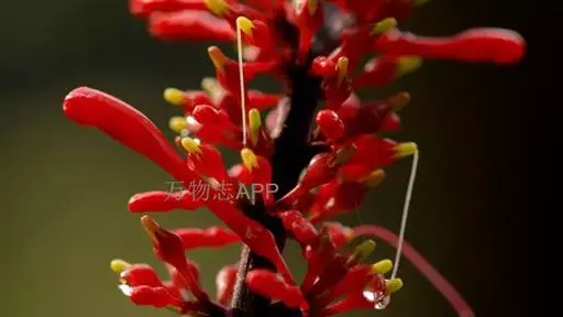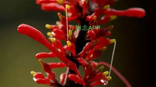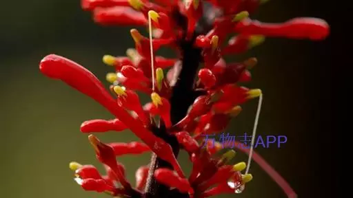 穗状花序,花红色,花梗细长;花萼钟状,5裂;花冠长管形,二唇形,上唇2裂,下唇3裂;可孕雄蕊2,不 孕雄蕊2;雌蕊心皮2,合生;花柱1,柱头2裂,子房2室,上位;蒴果,背裂2瓣。
