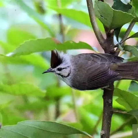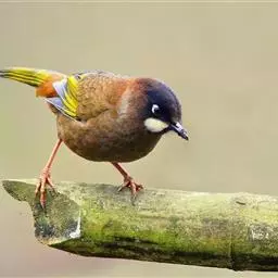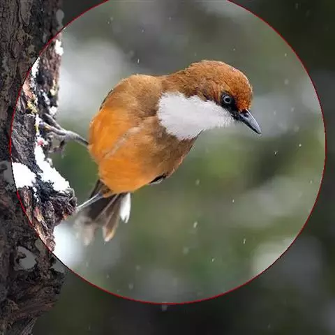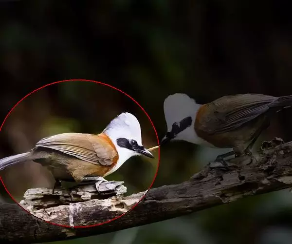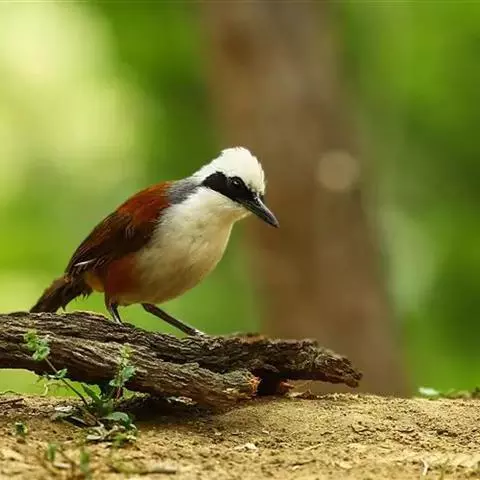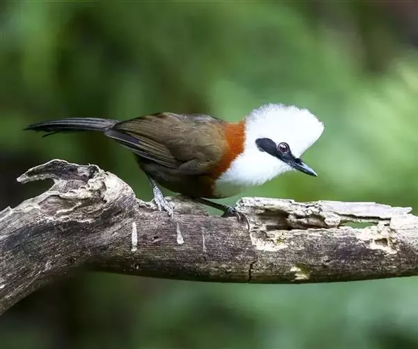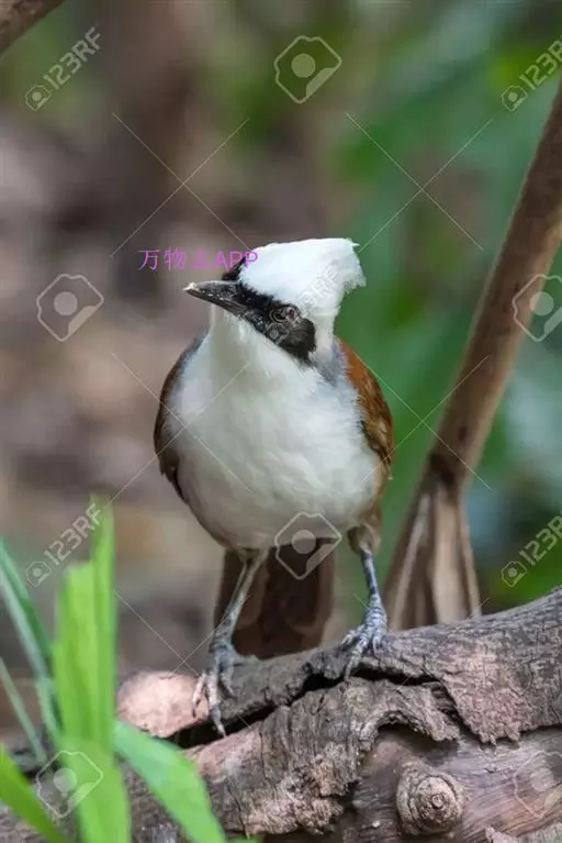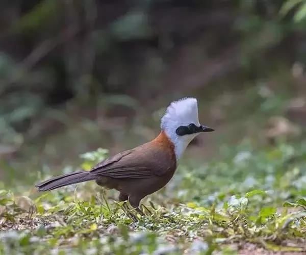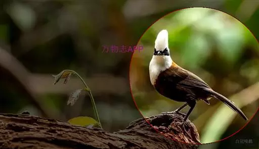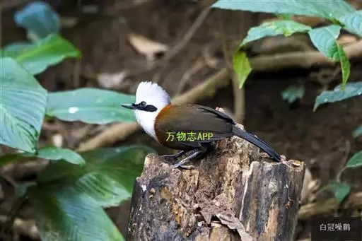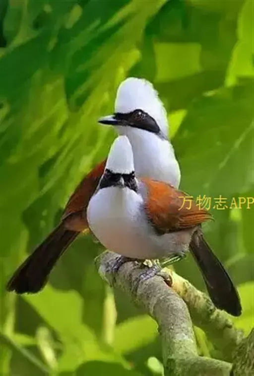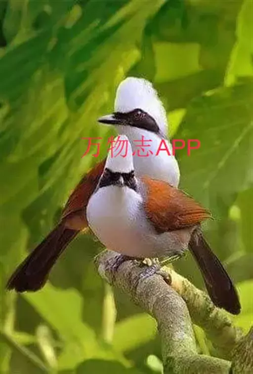 白冠噪鹛 白冠噪鹛雌雄羽色相似。整个头、头侧、羽冠以及颏、喉和上胸白色;前额基部、眼先、眼周和耳羽黑色,形成一条宽阔的黑色贯眼纹,在白色头部极为醒目;最长的冠羽后部逐渐变为灰色或棕灰色,紧靠头部白色之后有一锈红色或棕栗色领圈,沿颈侧延伸至同色的下胸,领圈后的上下体羽概为橄榄褐色。滇南亚种无领圈,白色头部后的后颈呈灰色或蓝灰色,背栗褐色往后渐淡,下体几全为白色,仅两胁和尾覆羽棕色;两翅和尾暗褐色微缀橄榄褐色。虹膜红褐色或棕红色,嘴黑色,脚黑灰色至淡褐色。
