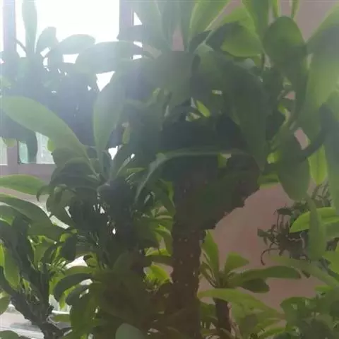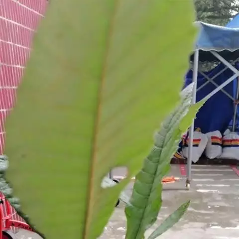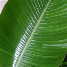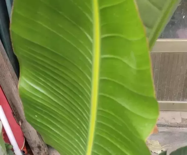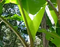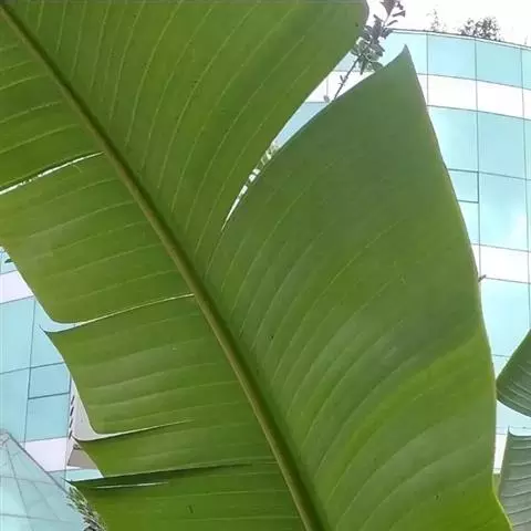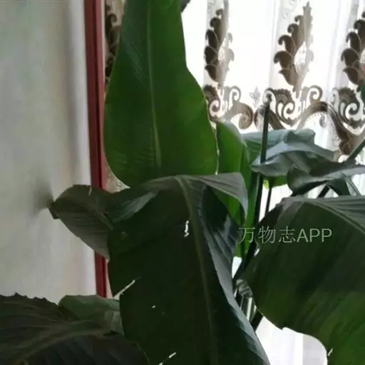 植株高2.5-4米。叶片长圆形,长2-3米,宽25-30厘米,先端钝,基部圆形或不对称,叶面鲜绿色,有光泽;叶柄粗壮,长达30 厘米。