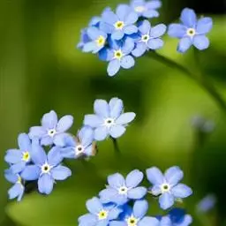 勿忘草 勿忘草株形柔美,茎枝纤细,叶片的形状很像柳树的叶子,无数朵小蓝花开满茎顶部的每个小枝,花瓣的蓝色仿佛是由天空的颜色染成的让人充满无限遐想。花朵中央有一圈黄色心蕊色彩搭配非常和谐。