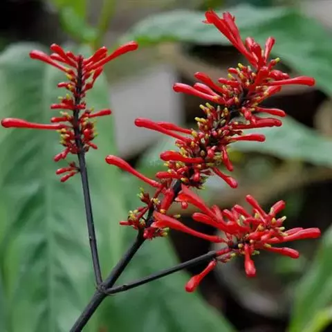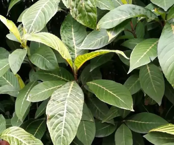 灌木,高达2米。叶具1-2.5厘米的柄,叶片矩圆形,倒卵形,顶端渐尖,或尾尖,基部楔形至宽楔形,下沿,边缘为波状圆齿,长9-15厘米,宽3.7-5.2厘米,侧脉7-12条。干时(?)常黄色。顶生穗状花序小,苞片大,长1.5厘米,宽8毫米,花萼2.2厘米,花冠5厘米,冠管4.5厘米,冠檐5-6毫米;雄蕊4,花丝细长,伸出冠外,疏被长柔毛,花药2室,密被白色毛,背着,基部稍叉开;花柱细长,柱头伸出管外,高于花药。